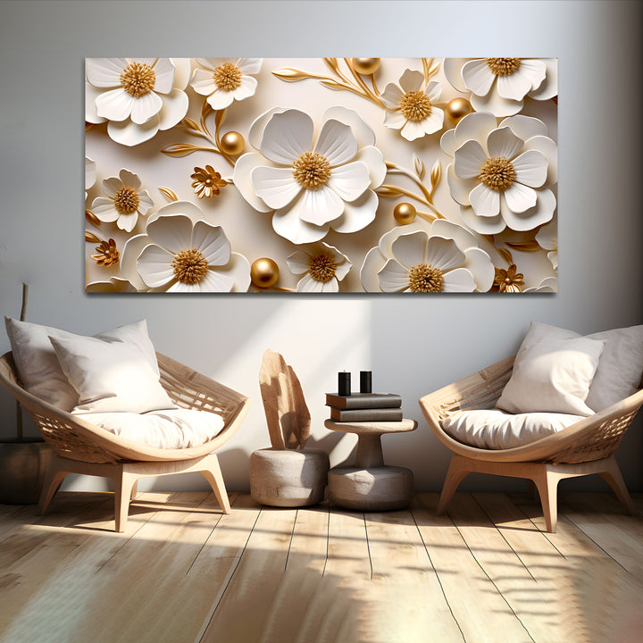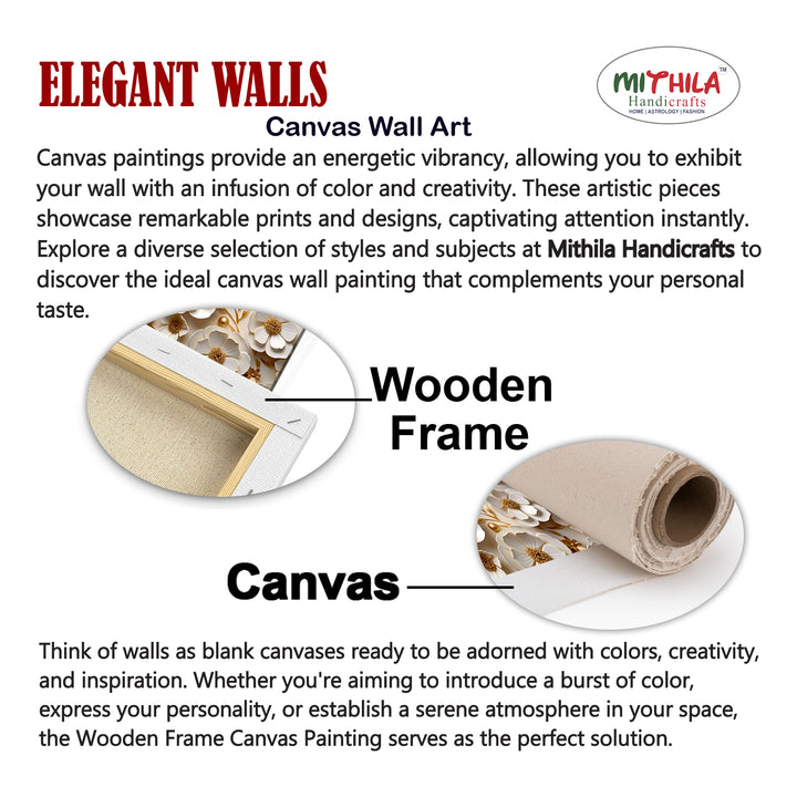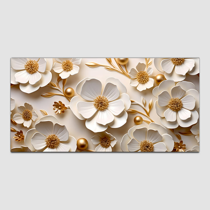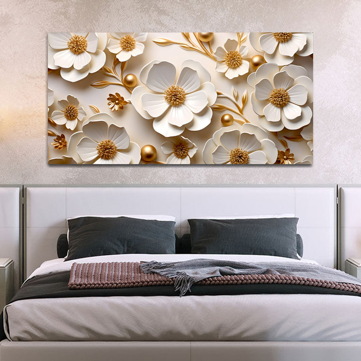 Beautiful white Flower Canvas Wall Painting and Arts can be described as a vibrant and lively depiction of various flowers in full bloom. Picture a canvas filled with a riot of colors, showcasing a garden or field of flowers in their natural beauty.The painting features a diverse array of flowers, from delicate roses in shades of pink, red, and white to cheerful sunflowers with their bright yellow petals. Other blooms like tulips, daisies, lilies, and peonies add a mix of colors such as purple, orange, blue, and cream, creating a harmonious and eye-catching composition.
