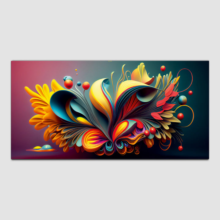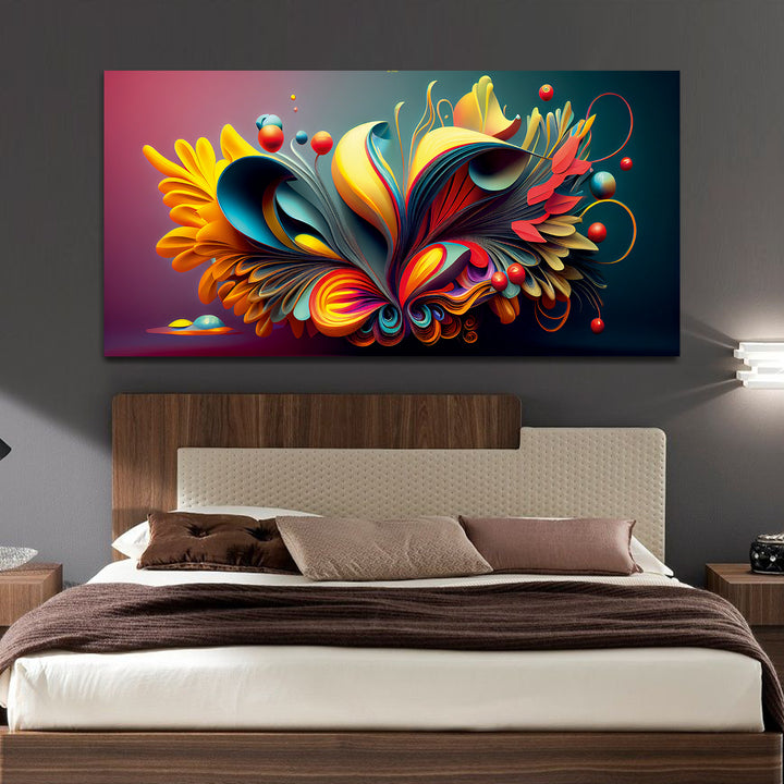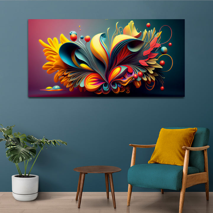 Beautiful modern painting features a bold and eclectic mix of colors, shapes, and textures, creating a visually stimulating and captivating composition. Geometric forms, abstract patterns, and fluid lines intersect and overlap, creating a sense of movement and energy on the canvas.The color palette is rich and varied, incorporating bright primary colors like red, blue, and yellow, as well as secondary and tertiary hues like purple, orange, green, and teal. Splashes of contrasting colors.This painting are perfectally used for living room, bedroom, kitchen, office, Hotel, dining room, office.