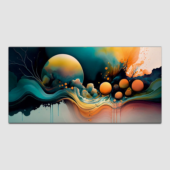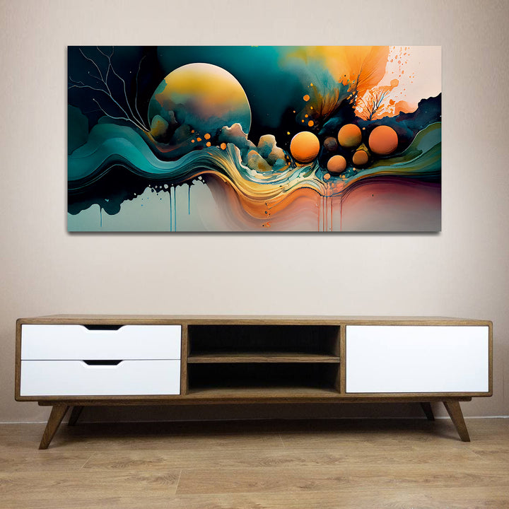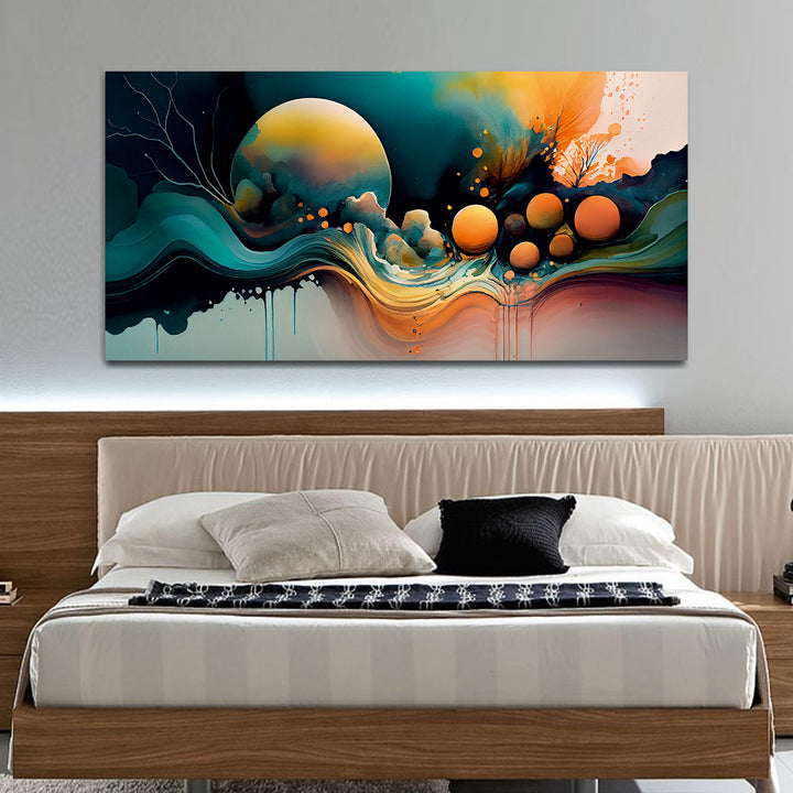 Beautiful modern painting features a bold and eclectic mix of colors, shapes, and textures, creating a visually stimulating and captivating composition. Geometric forms, abstract patterns, and fluid lines intersect and overlap, creating a sense of movement and energy on the canvas.The color palette is rich and varied, incorporating bright primary colors like red, blue, and yellow, as well as secondary and tertiary hues like purple, orange, green, and teal. Splashes of contrasting colors.This painting are perfectally used for living room, bedroom, kitchen, office, Hotel, dining room, office.