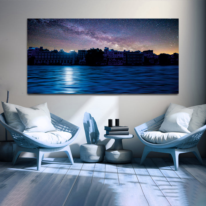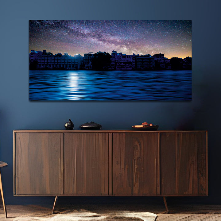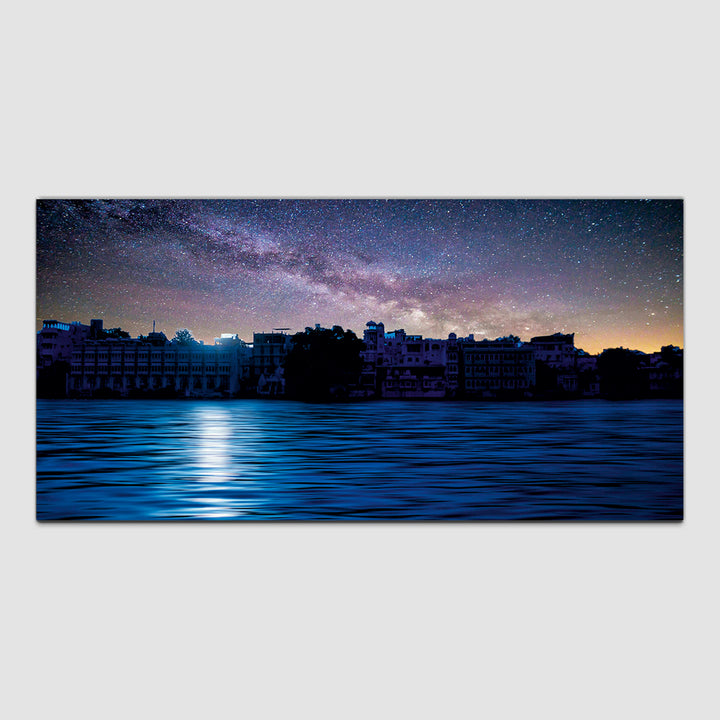 A beautiful city with blue river canvas wall painting is a captivating and imaginative artwork that combines urban architecture with underwater elements in a surreal and enchanting manner. The painting typically features a cityscape with skyscrapers, buildings, and landmarks submerged beneath the surface of the sea, surrounded by marine life and underwater scenery.