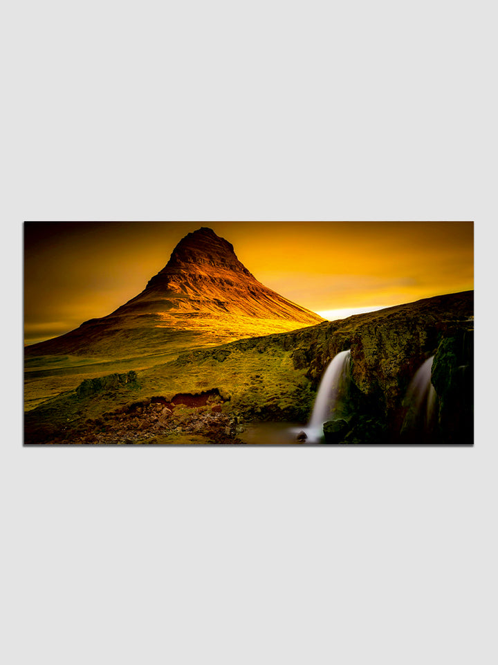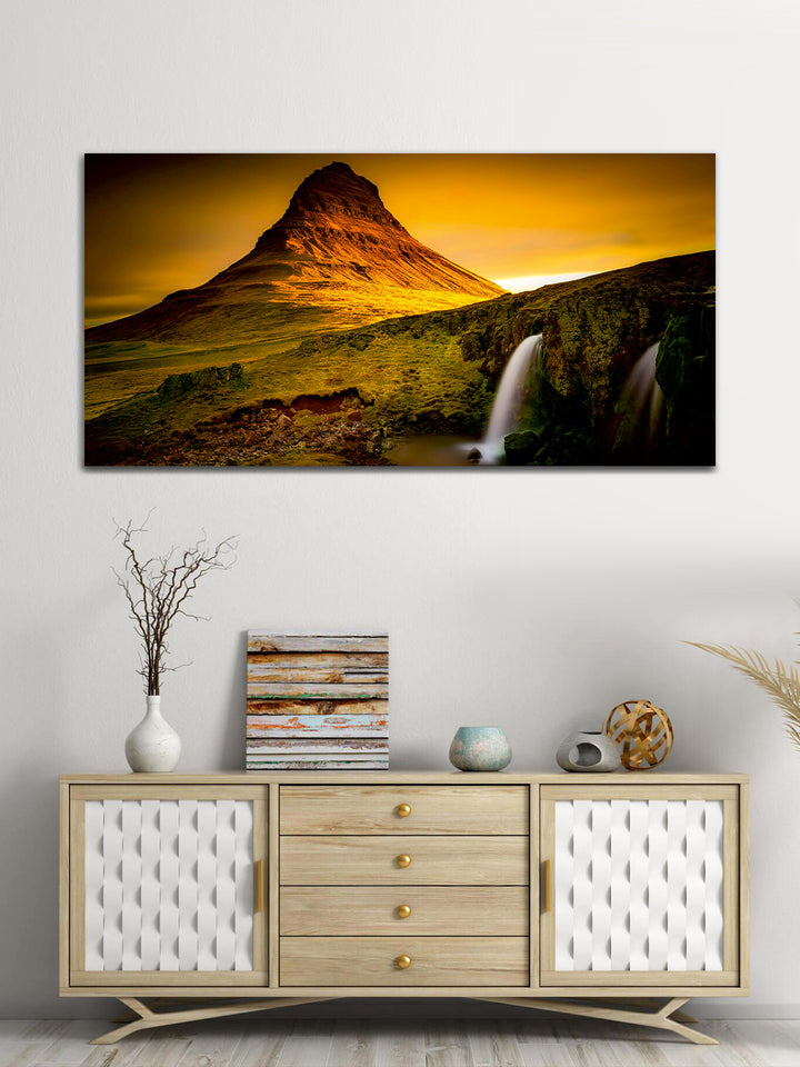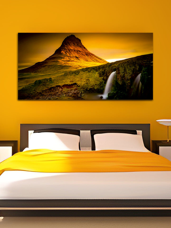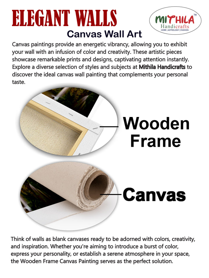 A Beautiful Green Mountain with Waterfall Canvas Wall Painting typically portrays a stunning natural landscape featuring a verdant green mountain adorned with a cascading waterfall. The painting may include elements such as lush forests covering the mountain slopes, rocks and boulders around the waterfall, a clear blue sky or a soft sunrise or sunset in the background, and perhaps a serene lake or river at the base of the waterfall.