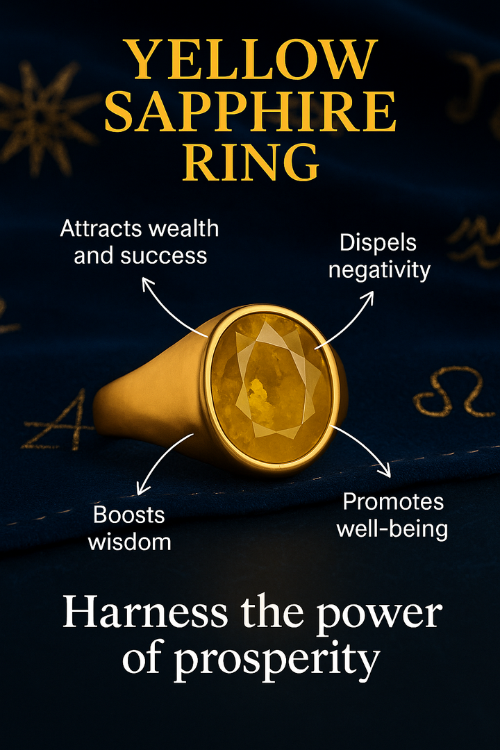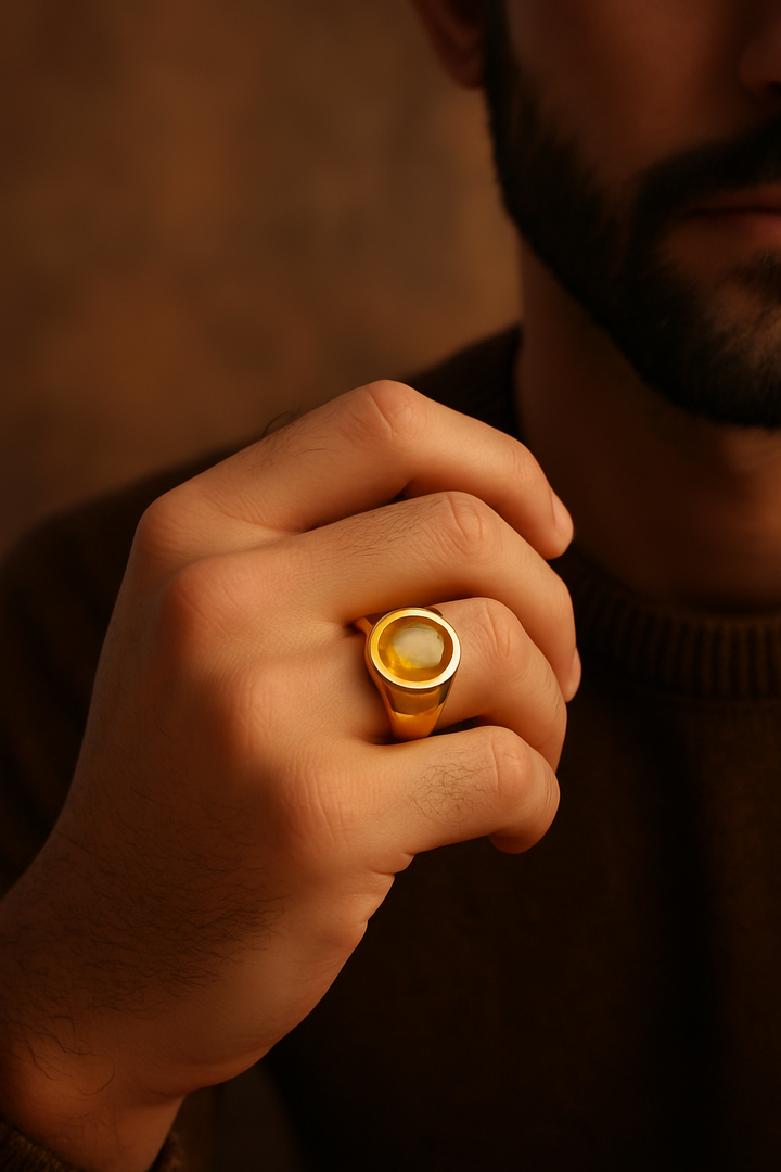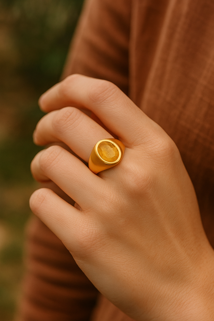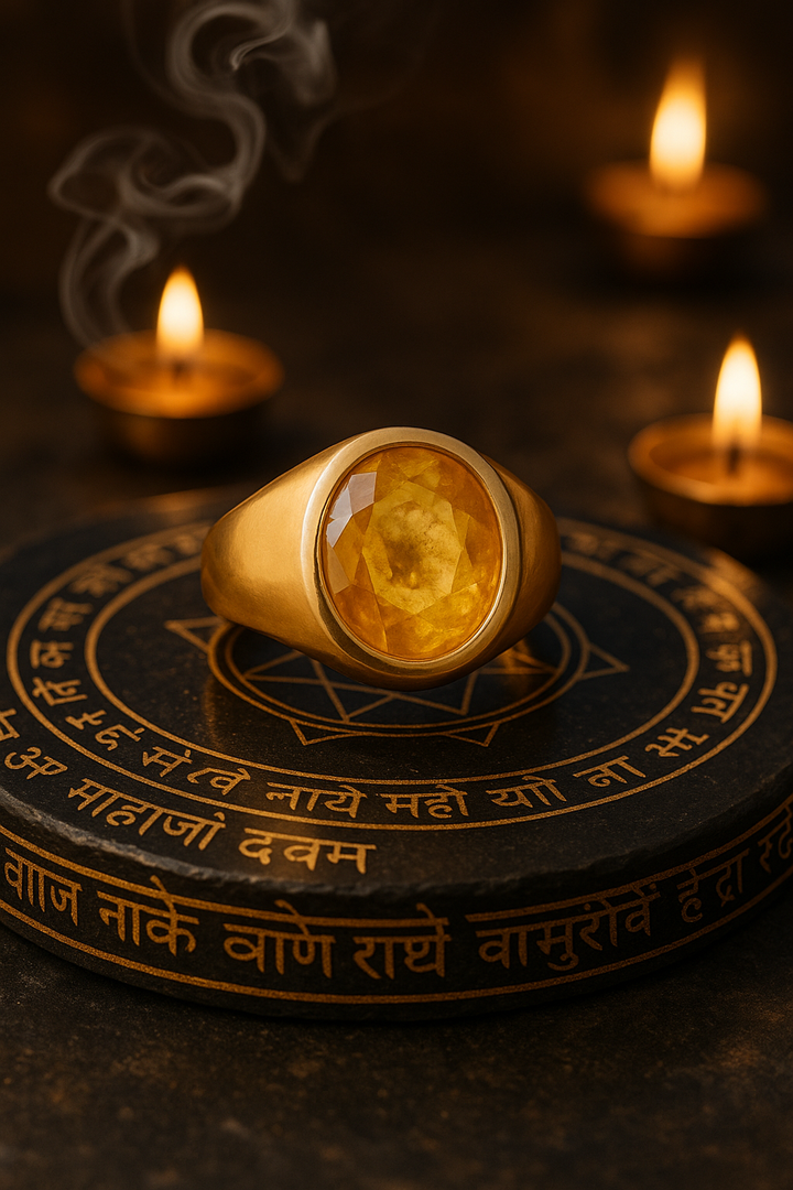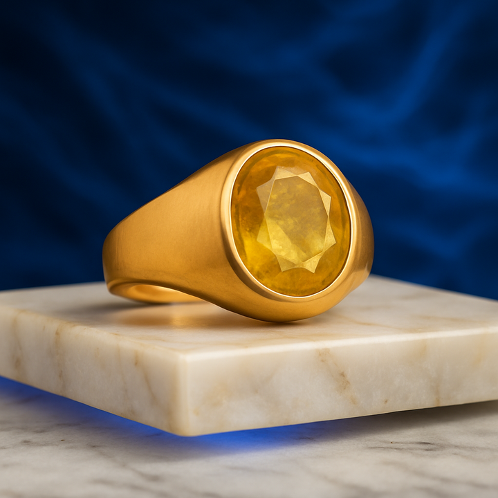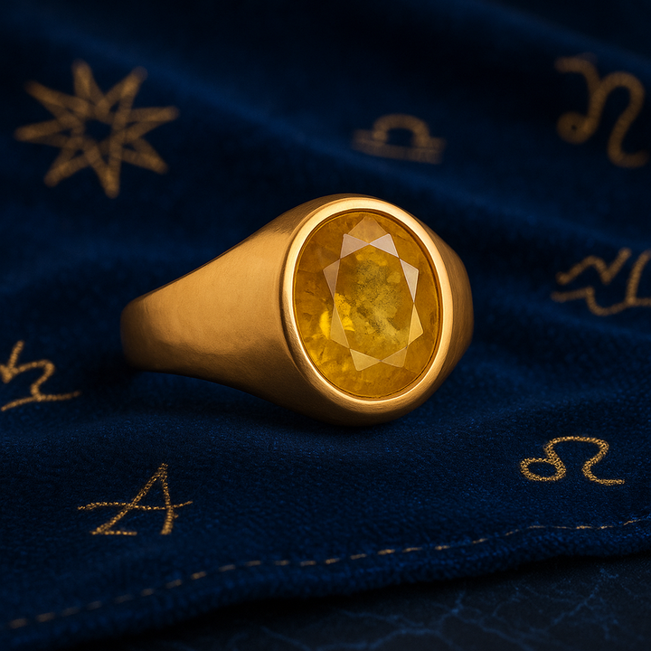 Wear the Yellow Sapphire Panchdhatu Ring to unlock success, higher knowledge, and divine blessings through the energy of Jupiter.